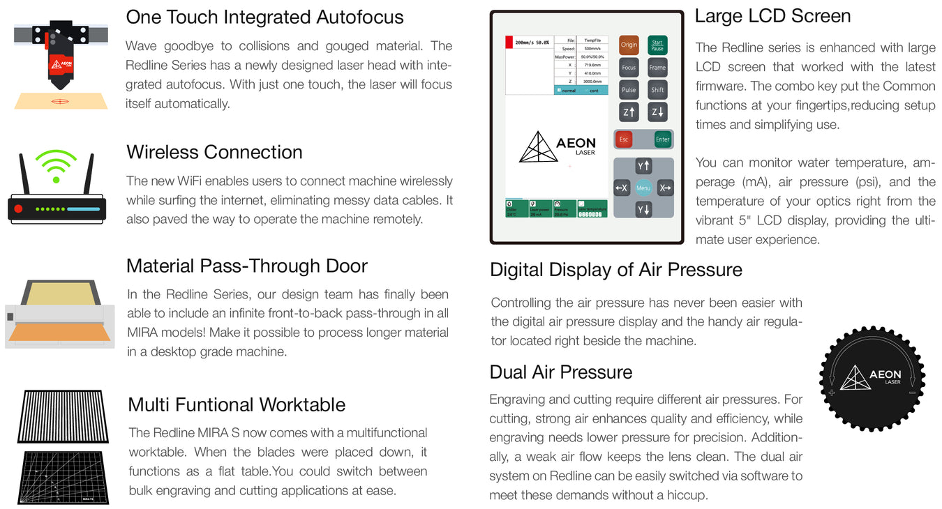 The Aeon Laser logo on the front access door panel is now backlit and doubles as a functional Status Light, illuminating white when in standby, red when an error is encountered, and green while in operation, adding both form and function to an already stunning design.